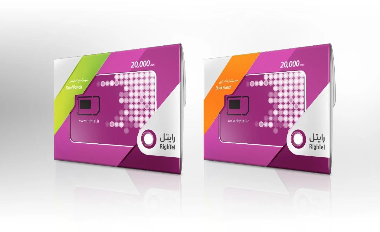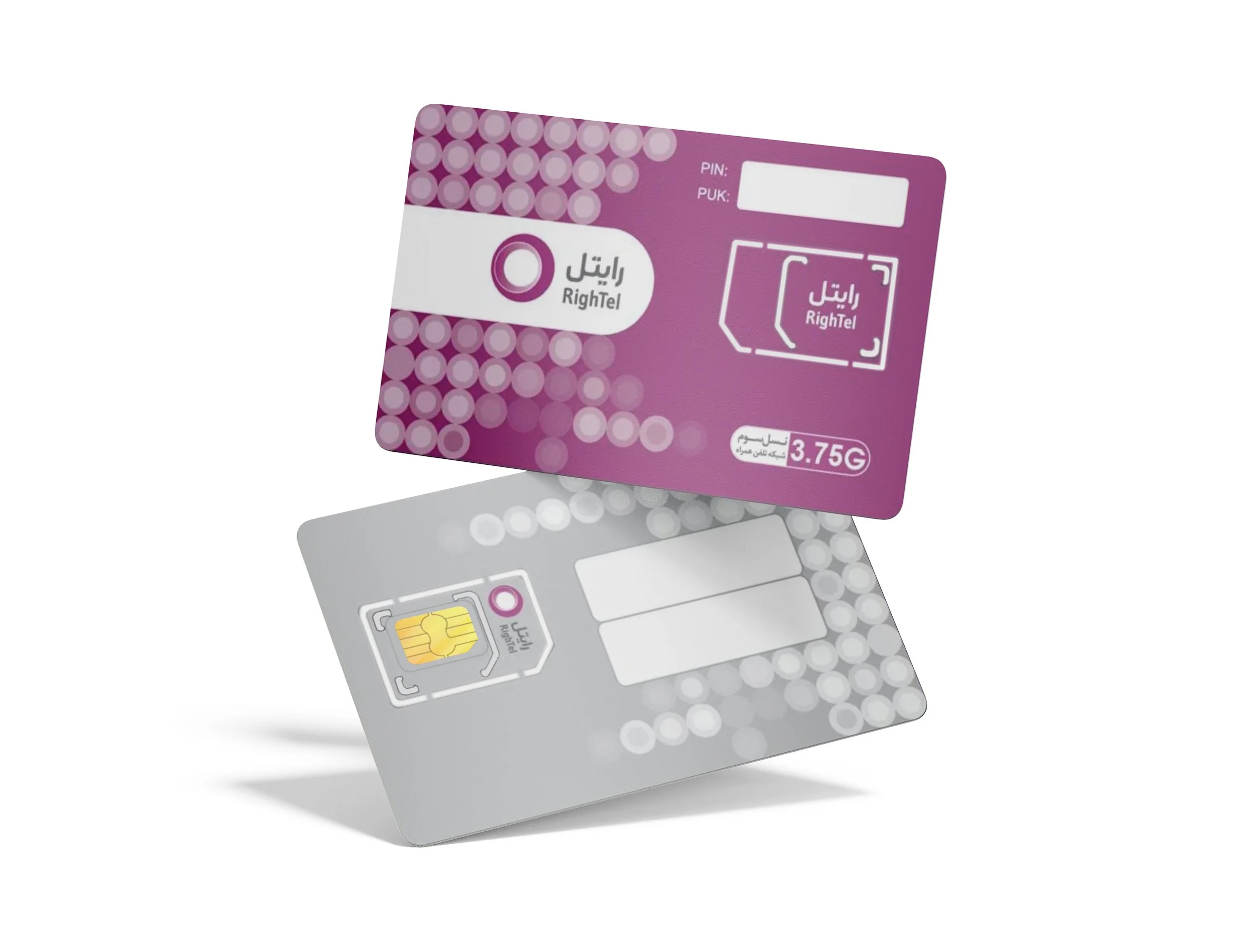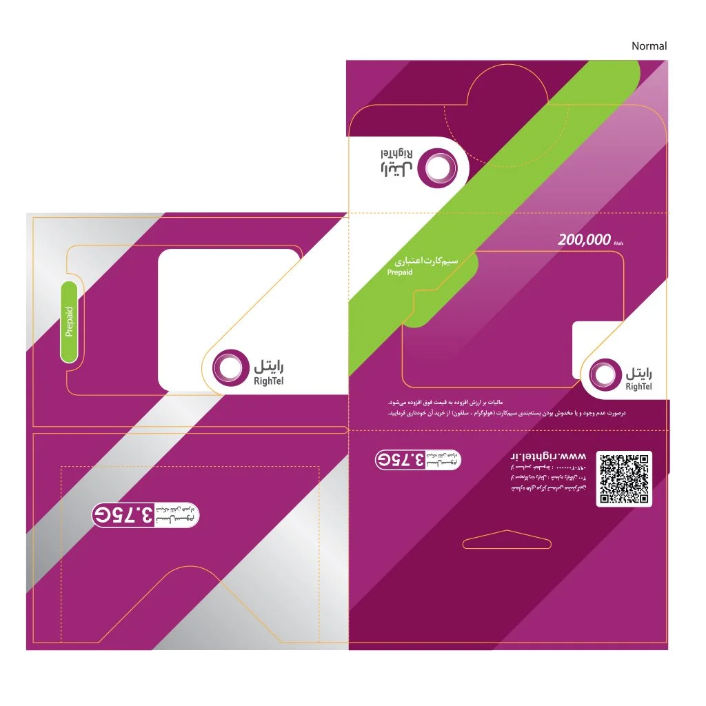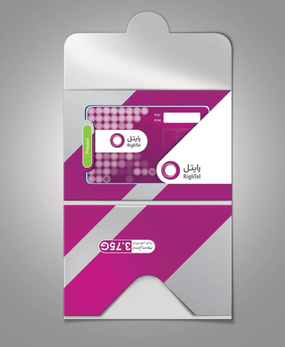 The SIM card design follows Rightel's brand guidelines, incorporating the company's distinctive colors and visual elements. It ensures proper technical placement of the SIM chip, with designated spaces for essential details like the PIN, PUK codes, and mobile number. The design also complements the packaging, ensuring compatibility and a cohesive brand experience.