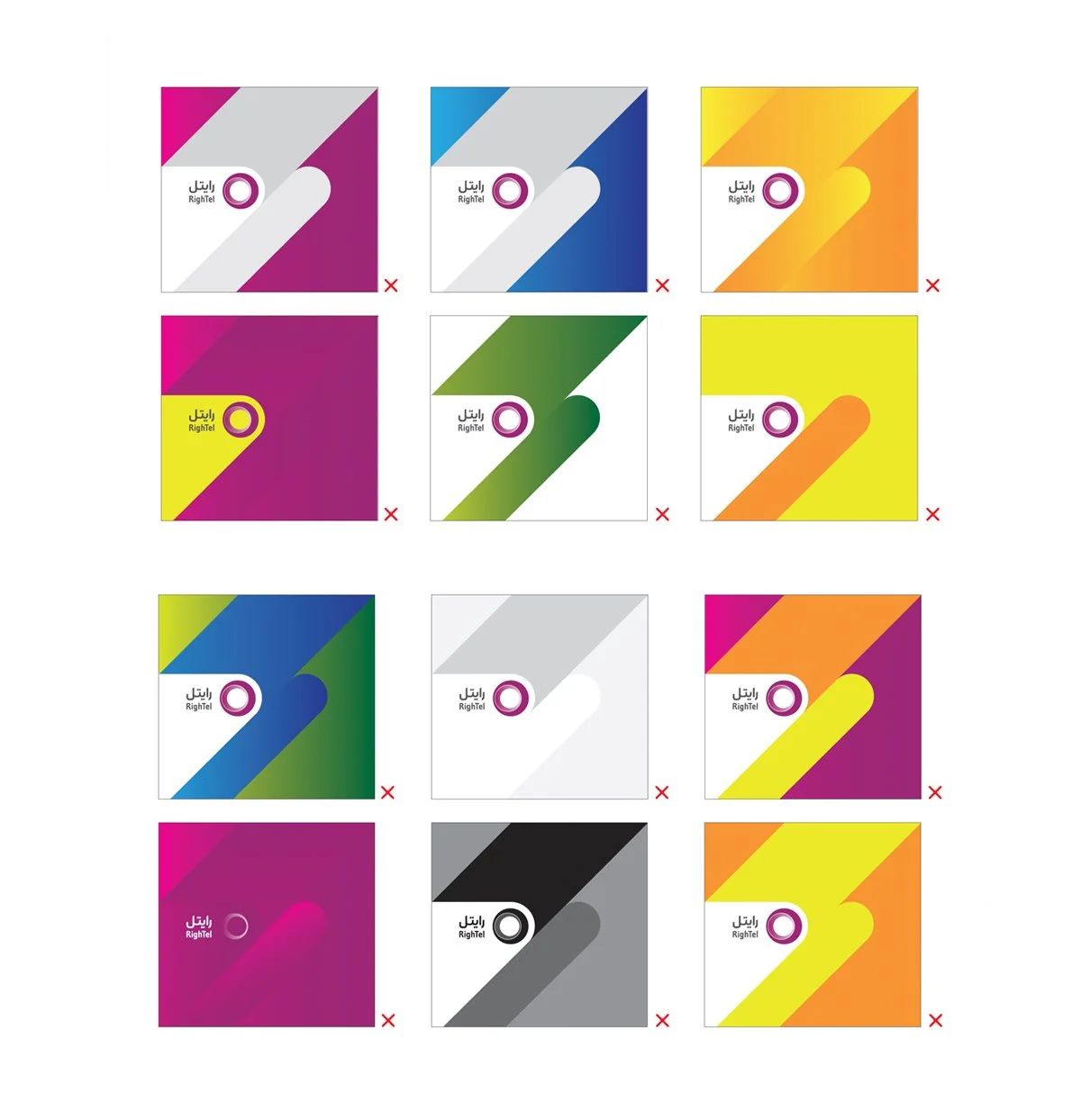 With the rebranding and new placement of the Rightel logo, specific guidelines were introduced to ensure proper background color usage. The logo should be placed on backgrounds that maintain clear visibility and brand integrity. Do use consistent color schemes that complement the brand palette, such as neutral tones or combinations from the primary and secondary palettes. Don’t place the logo on backgrounds with high contrast or clashing colors that reduce visibility, or use overly complex patterns that distract from the logo's clarity.