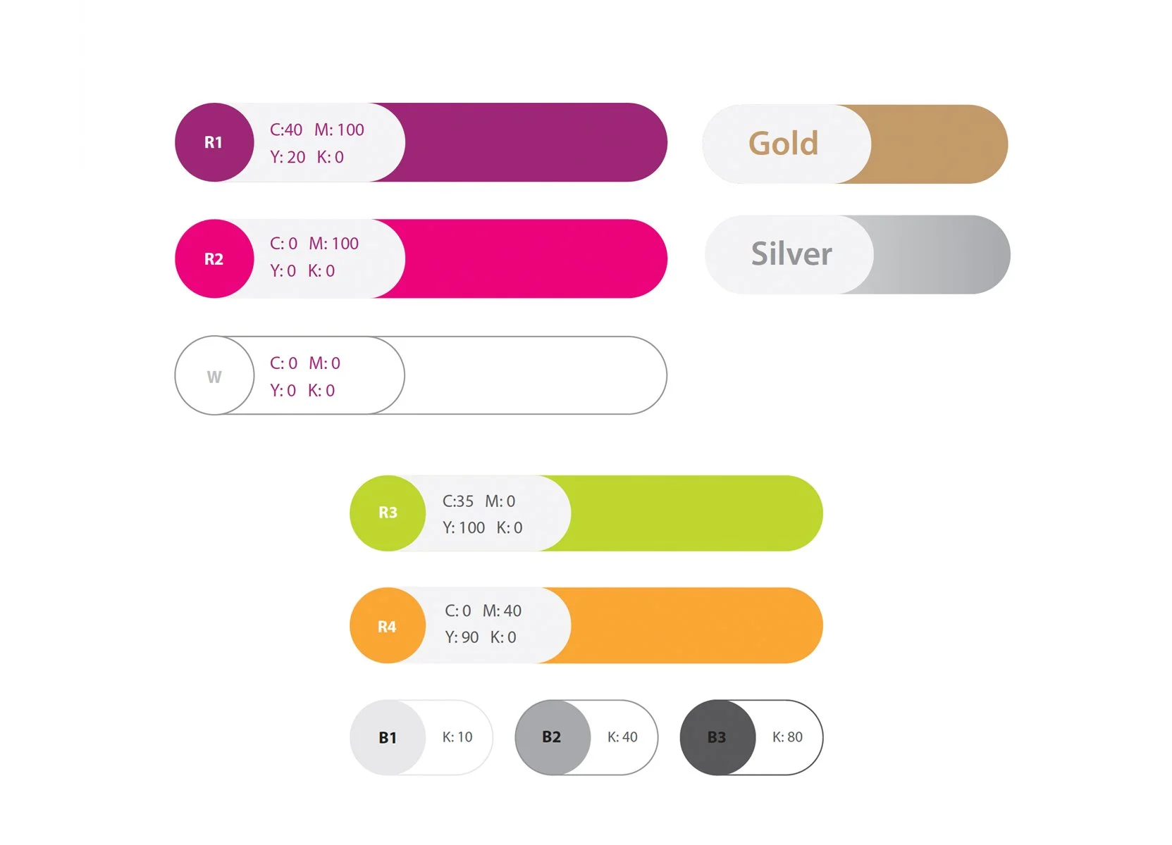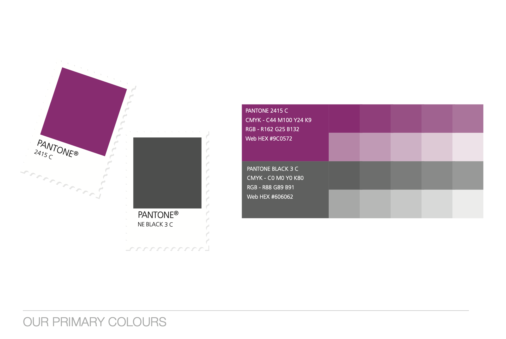 Rightel's color palette includes a bold magenta (Pantone 2415 C) and neutral gray (Pantone Black 3 C) as primary colors, reflecting energy, innovation, and professionalism. The tonal variations within these colors allow for flexible use across various media, maintaining a consistent and modern brand identity. The secondary palette features a vibrant lime green (Pantone 382 C) and soft lavender (Pantone 264 C), offering additional depth and versatility to the brand’s visuals, with tones that ensure a fresh and dynamic appearance in different contexts.