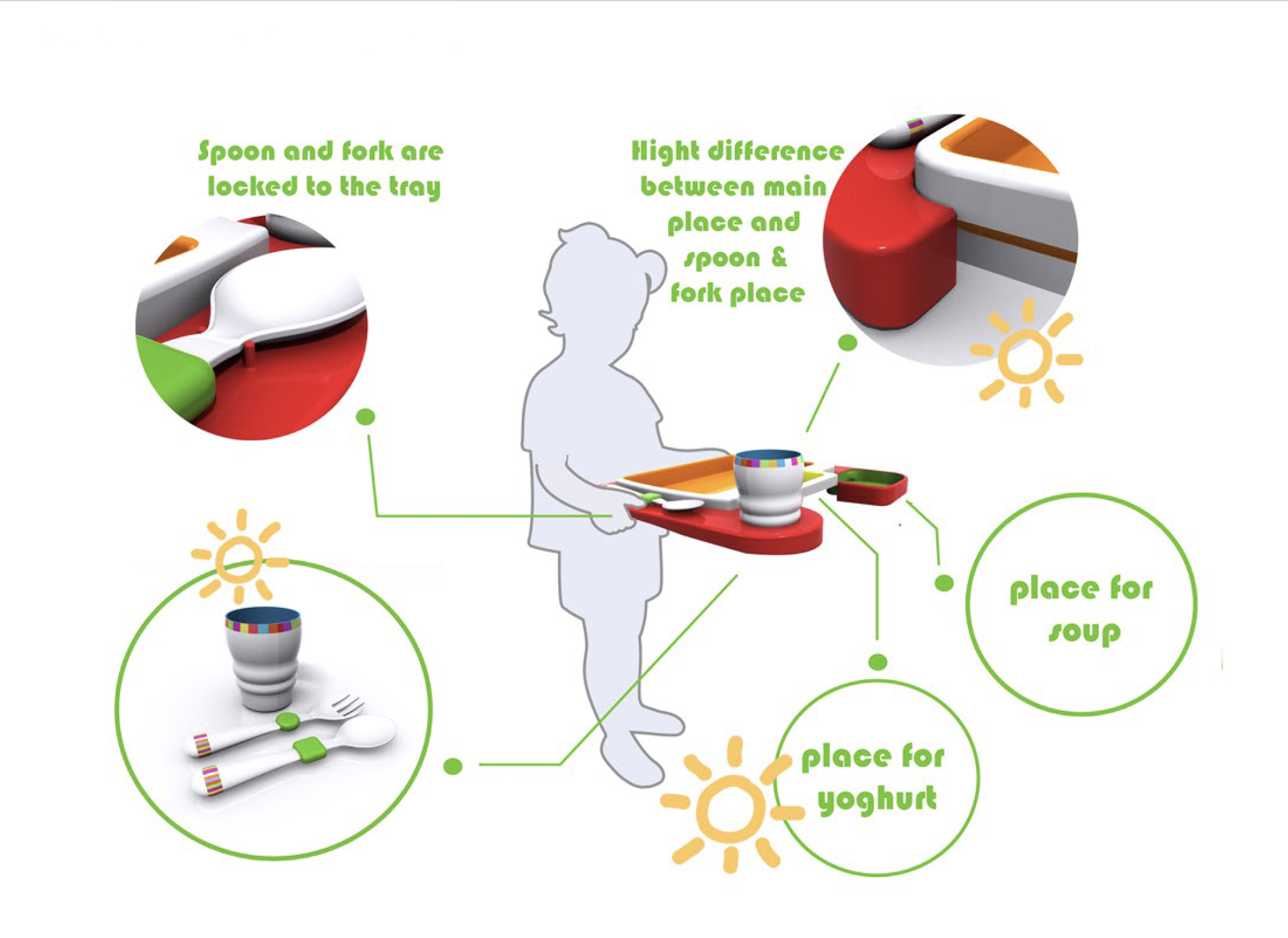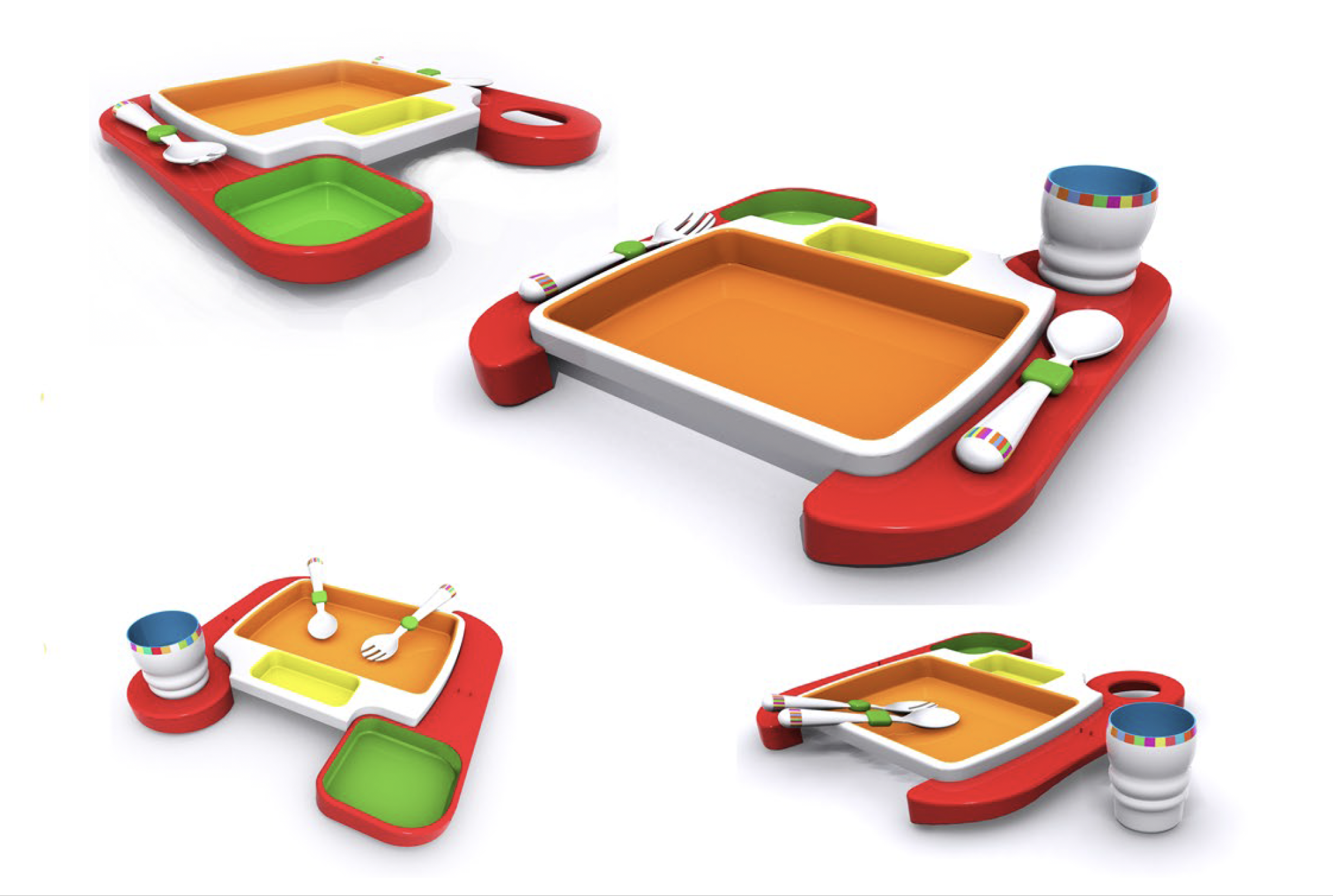 Constructed from durable ABS material, the plate is crafted with an optimized plastic injection molding process, ensuring it is safe, sturdy, and easy to assemble. The design includes dedicated spaces for a spoon and fork, which are securely locked onto the tray, as well as a designated cup area for independent access to beverages. Developed for Bita Plastic Manufacturing, this product combines functionality with child-friendly design.