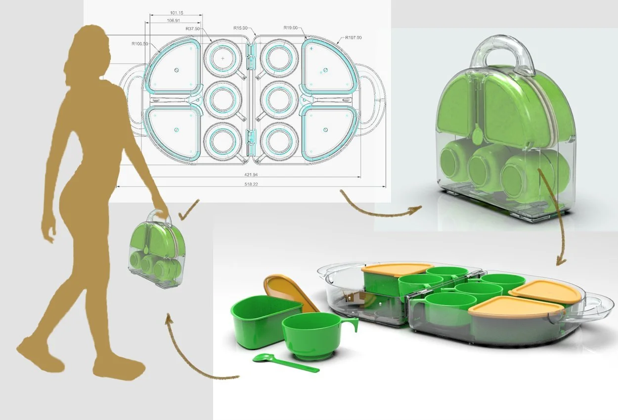This innovative self-service food container was designed for kindergarten children to encourage independent eating. The product makes mealtime more engaging by featuring colorful, visually appealing compartments for different types of food. The main compartment, in orange, is intended for the main dish, while smaller yellow and green sections are for yogurt and soup, respectively. The color scheme, using primary and complementary colors, was chosen to attract children’s attention and make eating enjoyable.