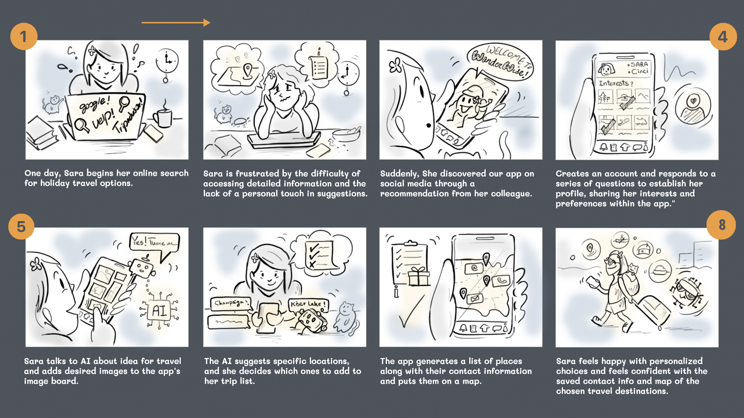 Introducing the storyboard for an innovative travel app empowered by AI, aimed at revolutionizing the way people explore the world. The project focuses on simplifying travel planning, reducing negative impacts, and inspiring users to discover unique destinations. By leveraging AI, the research process is streamlined, providing highly personalized recommendations tailored to individual preferences. The target user, aged 20-55, seeks independence in travel planning but values guidance in navigating options. They aspire to explore offbeat locations, driven by a desire for authentic experiences. The app not only fulfills their wanderlust but also promotes environmental consciousness, appealing to those eager to minimize their ecological footprint.