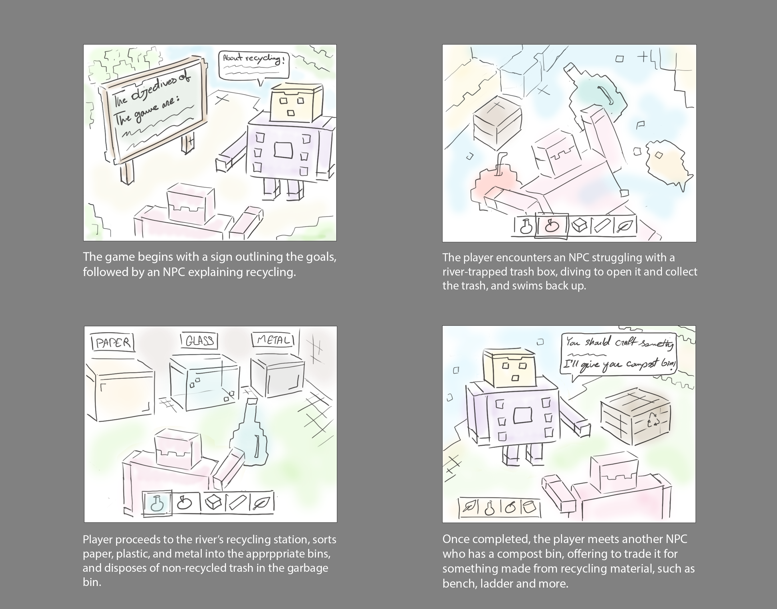 The River Game aims to educate players aged 13-15 about sustainability through interactive gameplay. Players engage in cleaning up a polluted river, recycling, upcycling, and composting. Through quests and interactions with NPCs, they learn practical skills and problem-solving. The game adheres to Situated Learning and Constructivist theories, emphasizing hands-on participation. Evaluation includes questionnaires to assess real-world skill transfer. The target audience's needs for problem-solving and sustainability education are addressed. Learning occurs within the game environment, utilizing Minecraft's interactive features. The game mechanics and narrative reinforce environmental learning, promoting a desire for sustainability.